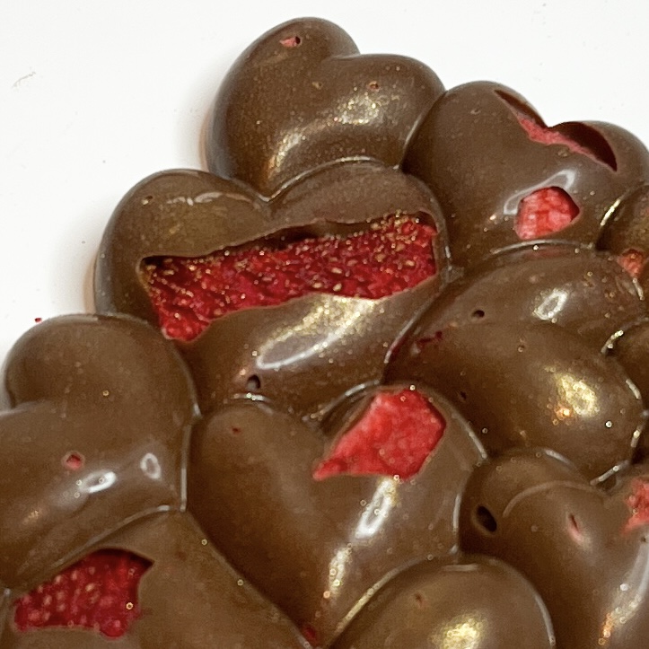 Klasyka, która nigdy się nie nudzi! Truskawkowe Love w wersji mlecznej to połączenie aksamitnej, rozpływającej się w ustach czekolady z kawałkami liofilizowanych truskawek. To smak dzieciństwa i letnich dni zamknięty w formie eleganckich, czekoladowych serc.