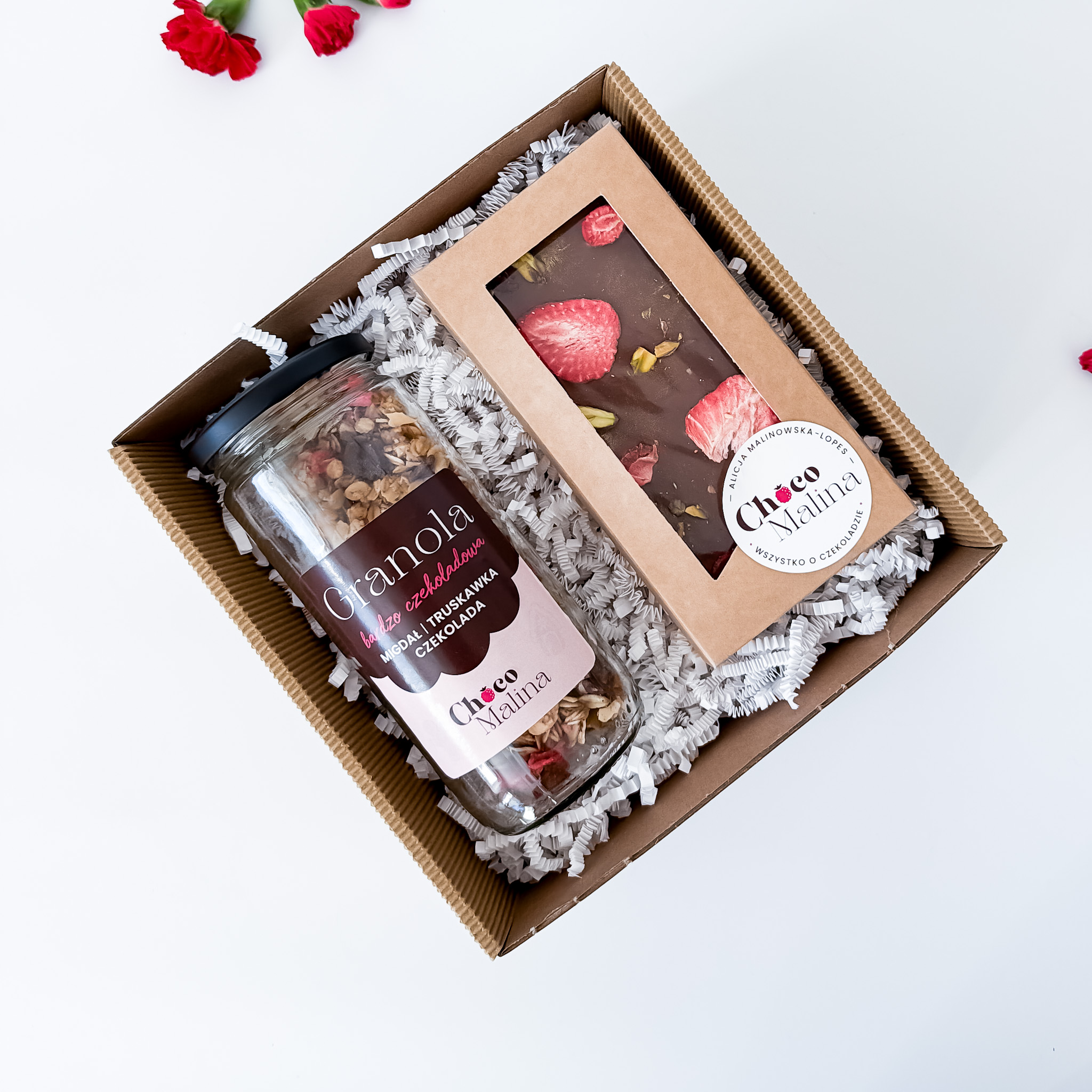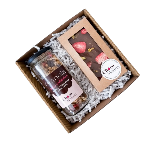 Podaruj bliskiej osobie (lub sobie!) moment czystej przyjemności z naszym autorskim zestawem prezentowym. Połączyliśmy w nim dwa rzemieślnicze hity ChocoMalina: chrupiącą, pełną witamin Granolę Malina, Orzech i Czekolada oraz ręcznie robioną Czekoladę Mleczną z Truskawką i Pistacją. To kompozycja, która celebruje wiosenną lekkość i najwyższą jakość składników. Całość została zamknięta w eleganckim pudełku z karbowanej tektury, wypełnionym ekologicznym siankiem i przyozdobionym kremową satynową wstążką z uroczą zawieszką w kształcie kwiatka.